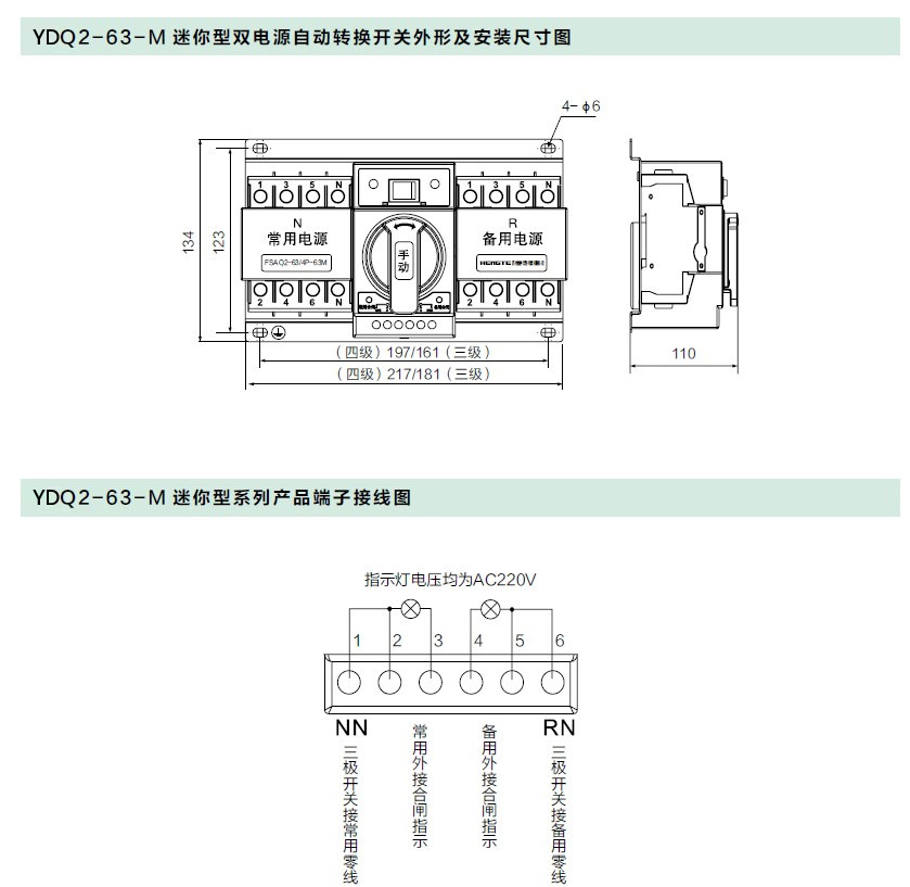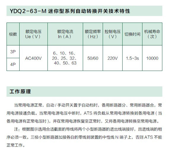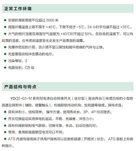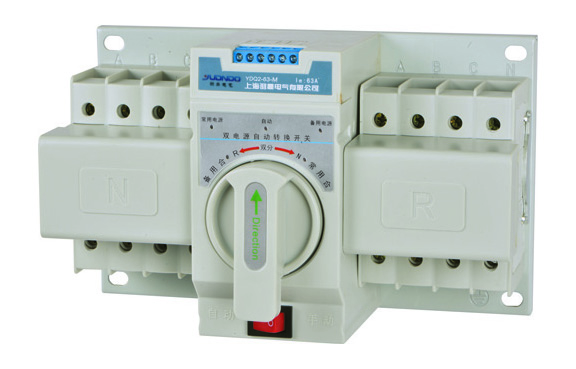 YDQ2-63-M 迷你型系列双电源自动转换开关(以下简称开关)采用本公司生产的小型高分断断路器制作而成,仅用于两路电源之间互相切换,不得使用于主电源开关,适用于交流50Hz,额定工作电压AC400V,额定工作电流63A 以下双电源供电系统,仅使用自动或手动操作方式完成常用电源与备用电源之间的切换。该转换开关主要用于医院、商场、银行、化工、冶金、高层建筑、军事设施等需要两路电源互相切换的场所。