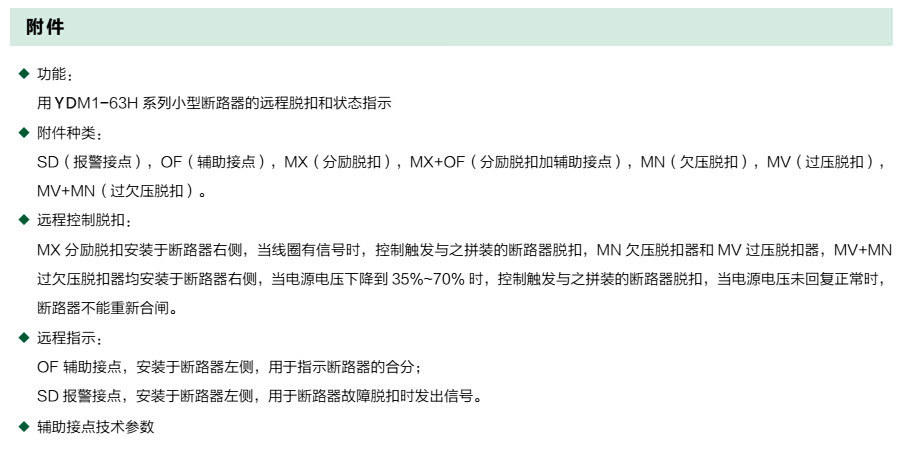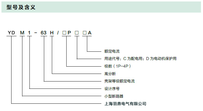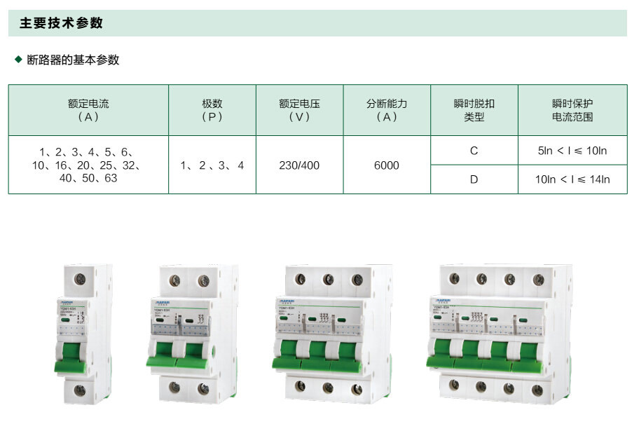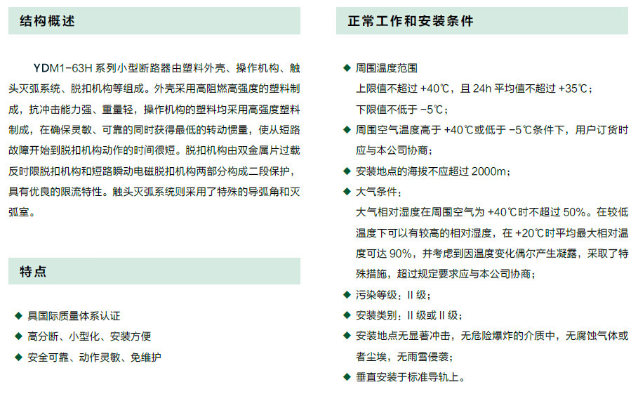 YDM1-63H 系列小型断路器主要适用于交流50Hz/60Hz,额定工作电压为230V/400V 及以下,额定电流至63A 的电路中,该断路器主要用于现代建筑电气线路中设备的过载、短路保护,亦适用于在正常情况下线路的不频繁操作与隔离。