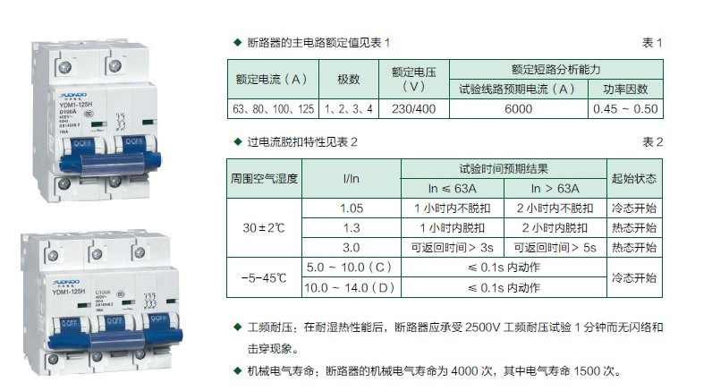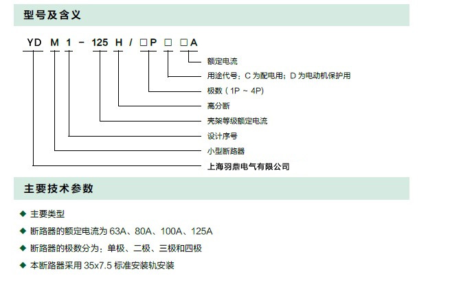 YDM1-125H 系列小型断路器适用于交流50/60Hz,额定电压400V及单相230V,额定电流125A 及以下的线路中,用来对建筑物和电气设备进行短路、过载保护之用,也可在正常情况下,作为线路的不频繁的转换,也适用于隔离开关及作为线路欠压保护和远程断开。