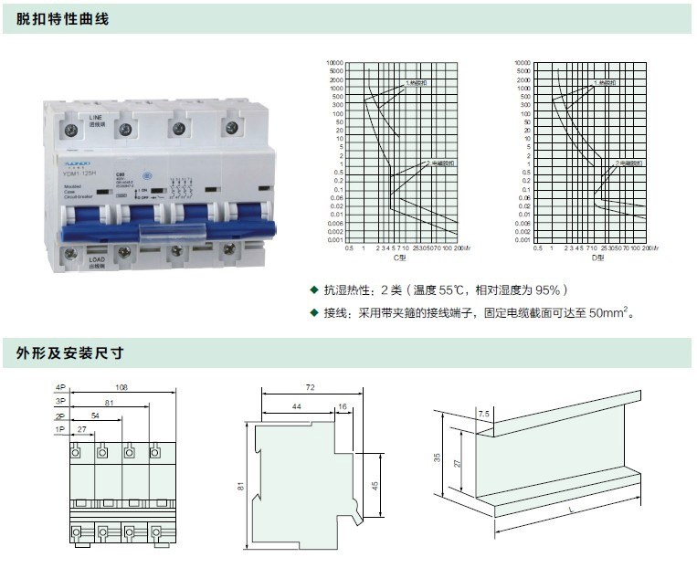 该产品外形美观、体积小、重量轻、电流脱扣整定精确、动作可靠、分断能力高、脱扣迅速、导轨安装、组合模式设计可与辅助触头、报警指示触头、欠压脱扣器、分励脱扣器等附件组合,满足不同用户的需求,壳体和部件采用高阻燃及耐冲击塑料,使用寿命长。
